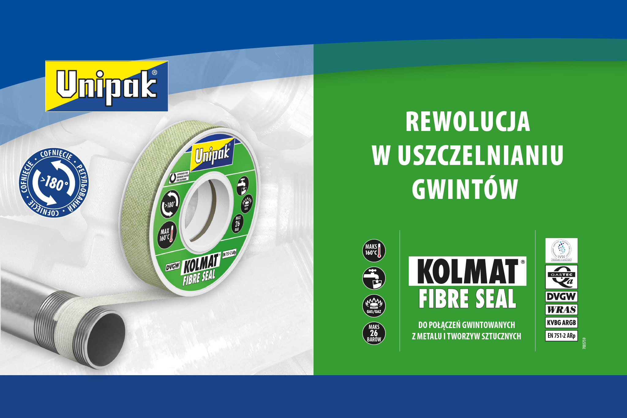 Ten opatentowany produkt spełnia (między) narodowe normy certyfikacyjne, takie jak PZH, GASTEC, DVGW, WRAS, KVBG/ARGB oraz europejską normę EN 751-2. Zgodnie z normą EN 751-2, uszczelnienie Kolmat® Fibre Seal został przetestowany pod kątem zastosowań gazowych do 5 barów w temperaturze od -20 °C do +70 °C oraz zastosowań wodnych do 16 barów w temperaturze +95 °C i do 7 barów w temperaturze +130 °C.